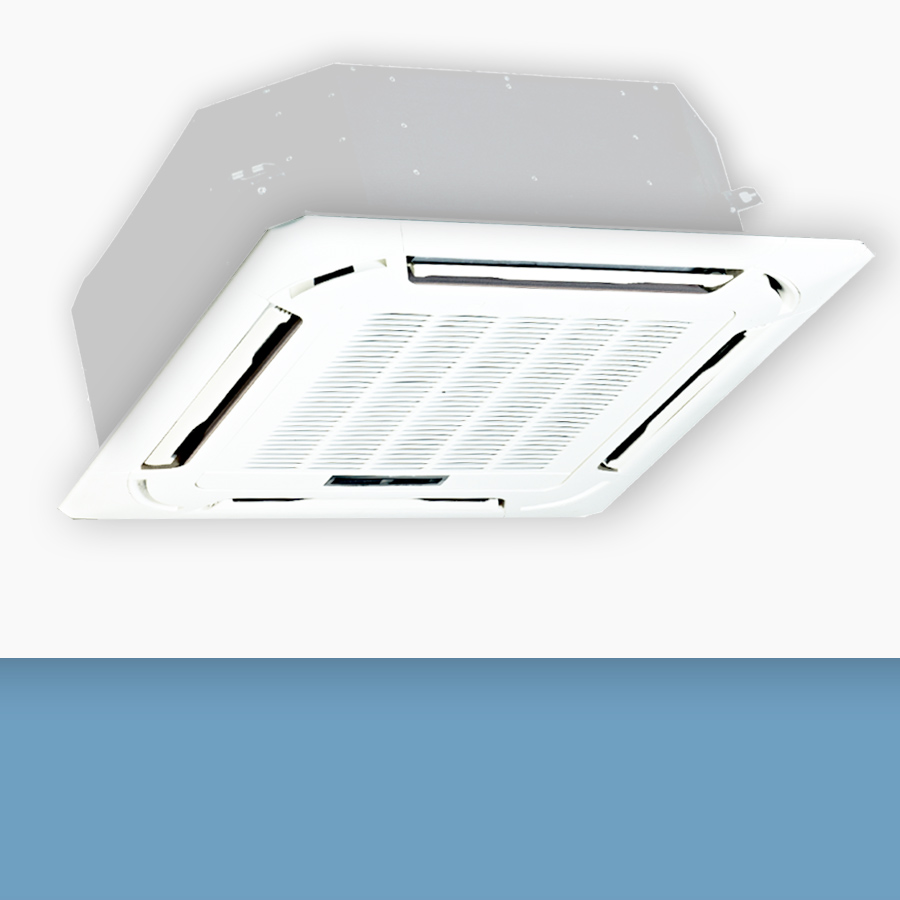 Kassettengeräte werden in abgehängte Decken eingebaut, so dass nur das Panel sichtbar bleibt. Die Geräte saugen die Luft mittig an und blasen an allen vier Seiten aus, wobei sie sich den Coanda- Effekt zu Nutze machen. Die Luft streicht an der Decke entlang und fällt langsam in den Raum ab.